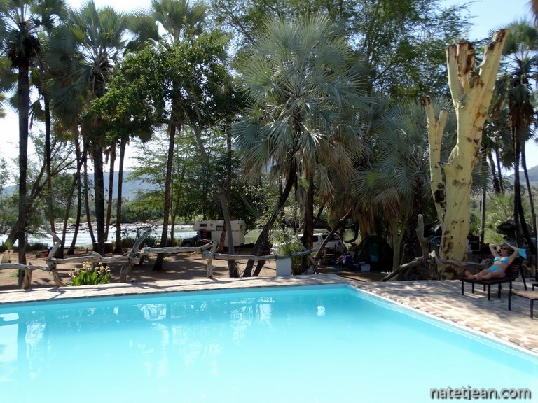 Après de longues heures de route de montagnes, nous arrivons enfin à Epupa Falls, petit oasis où poussent les palmiers le long de la Kunene river qui marque la frontière avec l'Angola. Nous nous installons dans un des camps d'Epupa. Les chutes ne sont pas gigantesques mais le panorama est très beau. Bien que notre camping soit situé juste en amont des chutes, nous nous baladons le long de la rivière Kunene afin de les apercevoir un peu mieux et surtout pour nous dégourdir les jambes; nous en avons un peu marre de rouler et avons besoin de faire un peu d'exercice.