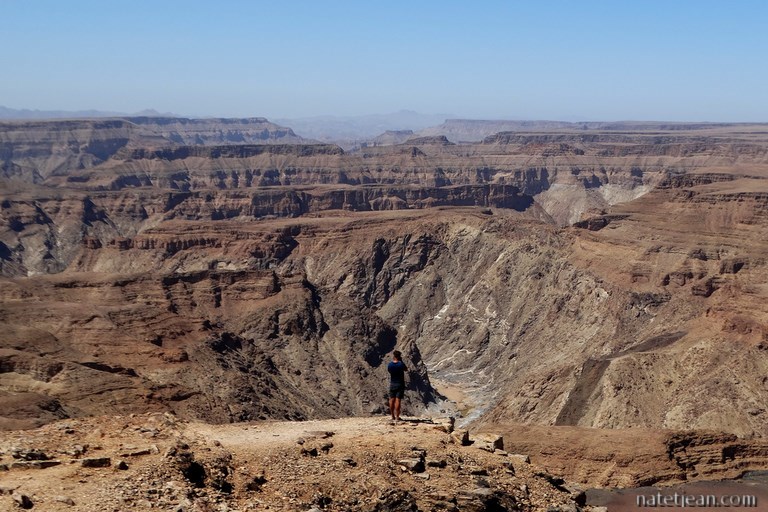 Cela semblait mal parti mais on finit par y arriver à ce fameux canyon de la Fish River et ça vaut le coup. Le panorama est grandiose. Quelques points-de-vue, que l'on parcourt en véhicule, sont aménagés le long du canyon à une dizaine de kilomètres de l'entrée du parc. A cet endroit, le fleuve ou plutôt le lit du fleuve car il ne reste que quelques gouilles d'eau, forme des méandres à plusieurs centaines de mètres au-dessous de nous. La roche, le sable, le vide, le soleil de plomb, ici, le désert est infini.