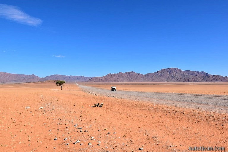Après 2 jours de route et 160 km sur la mauvaise piste C27 dans le désert du Namib, nous arrivons en début de matinée à Sesriem, porte d'entrée de Sossusvlei, un des plus beaux endroits de Namibie. Si le réseau routier pour arriver à Sesriem n'est pas terrible (des cyclistes nous confirmeront que la piste venant du nord "it is shit" également), en revanche, les 65 km qui mènent aux dunes et au lac salé de Sossusvlei sont goudronnés. On se réjouit de ce passage même si cela enlève un peu de parfum d'aventure. Mais pour l'aventure, les Namibiens ont tout prévu ; les 4 derniers kilomètres se font sur une piste très sablonneuse ou seuls les 4x4 de moins de 3.5t sont autorisés à aller. Jean qui a pris goût à ce type de terrain se régale et comme d'habitude, dans le sable, notre pick-up Isuzu est épatant (pression des pneus 1.8b).