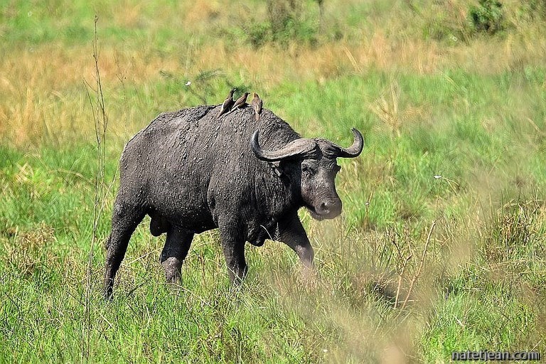 Avant de prendre la direction d'Ishasha pour aller voir les lions, nous faisons un détour jusqu'au village de Katwe au bord du lac Edward. Le long de la route, nous croisons plusieurs troupeaux de buffles et de cobes. Au bord du lac, peu avant Katwe, nous apercevons une harde d'une cinquantaine d'éléphants se désaltérant. En escaladant le talus, on s'approche d'eux et l'on voit qu'il n'y a pas que des pachydermes mais aussi des dizaines d'hippos et des crocos. Nous restons sur place pour pique-niquer lorsque d'autres éléphants approchent. Comme nous sommes sur leur chemin, nous nous déplaçons pour ne pas risquer de se faire chahuter mais il semble bien qu'ils nous ignorent.