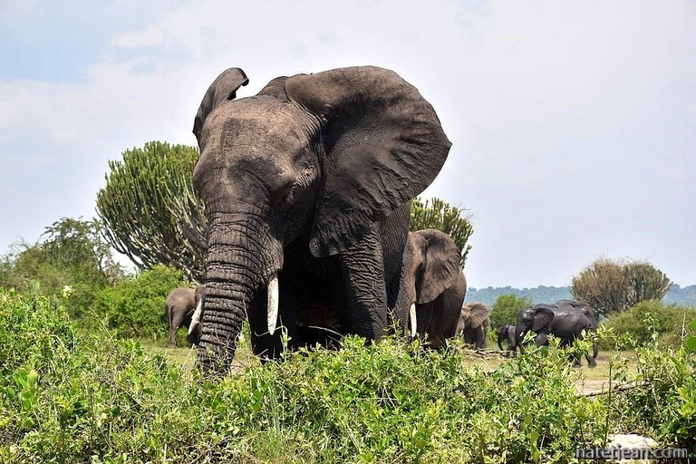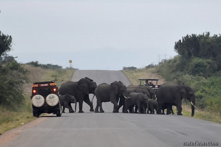Le parc Queen Elisabeth n'est pas clôturé ce qui explique que l'on voit la faune sauvage partout, même sur la route principale. Au retour vers Katunguru, des éléphants traversent devant notre véhicule et lorsque nous arrivons au camp communautaire de Kisenyi, le Kisenyi Lake Retreat, pour passer la nuit entre Katunguru et Ishasha, d'autres éléphants nous y attendent encore. Dans la nuit, nous entendons le grognement d'un hippo et au petit matin des cobes et des grues gambadent autour de notre véhicule. On se demande bien ce que l'on peut voir de plus dans les réserves du parc !