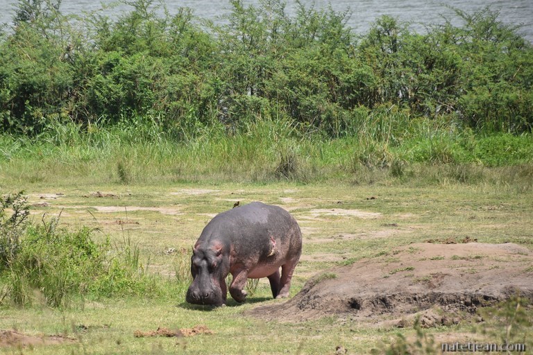 Le lendemain, ce n'est pas fini ; notre entrée étant encore valable jusqu'à midi, il nous reste 5 heures pour visiter une autre partie du parc. Nous nous rendons dans la partie nord-est qui jouxte le lac George, Kasenyi. Ici, la piste est meilleure mais, il y a très peu d'animaux. Un seul éléphant aperçu contre une dizaine ce matin avant l'entrée. Quelques buffles, de nombreux hippos dans le lac et 4 lions aperçus aux jumelles. L'endroit est un peu décevant. Cela confirme notre impression, il y a d'avantage d'animaux à voir en dehors des réserves qu'à l'intérieur. A posteriori, on se demande si cela vaut bien le coup de payer l'entrée.