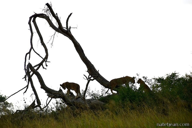 En milieu d'après-midi, nous apercevons enfin 4 lions. S'ils sont bien sur un arbre, ce n'est pas un figuier comme on s'y attendait mais un arbre mort. Nous avons à peine le temps de les voir qu'un orage éclate ; on se décide alors à rentrer. Nous voulons être ce soir à Katunguru et pour cela nous devons d'abord rejoindre la porte de Katookye au nord d'Ishasha puis reprendre la piste principale de 75 km. Nous en avons pour 3 ou 4 heures de pistes, de très mauvaises pistes. Heureusement que la nuit ne tombe pas avant 19 heures.