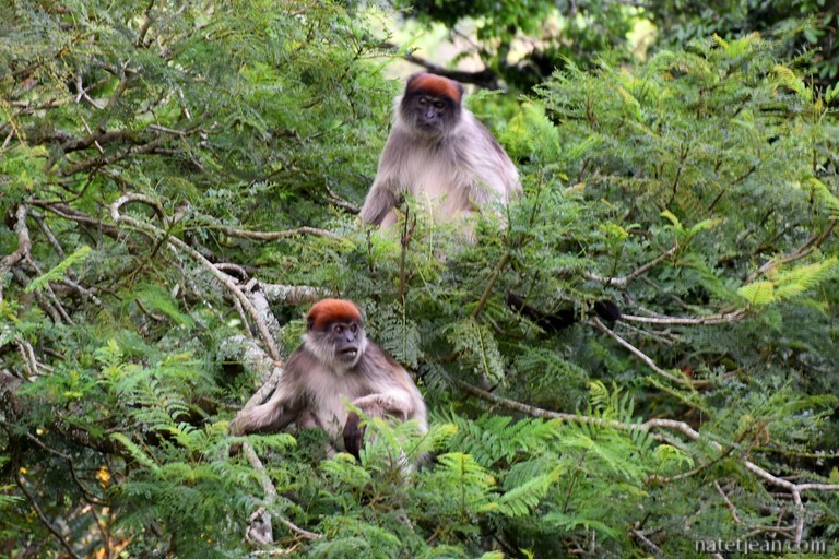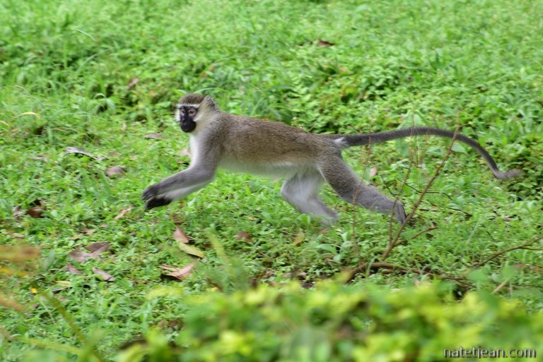 En balade au bord du lac Nkuruba et dans le camp même, nous retrouvons les mêmes singes qu'à Kasenda, colobes et vervets, toujours aussi nombreux. En Ouganda, nous avons maintes fois aperçu des colobes noirs et blancs en pleine nature et dire qu'au Rwanda, au parc national Nyungwe, il fallait prendre un guide pour les voir et payer 70$ par personne...