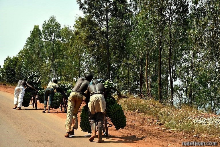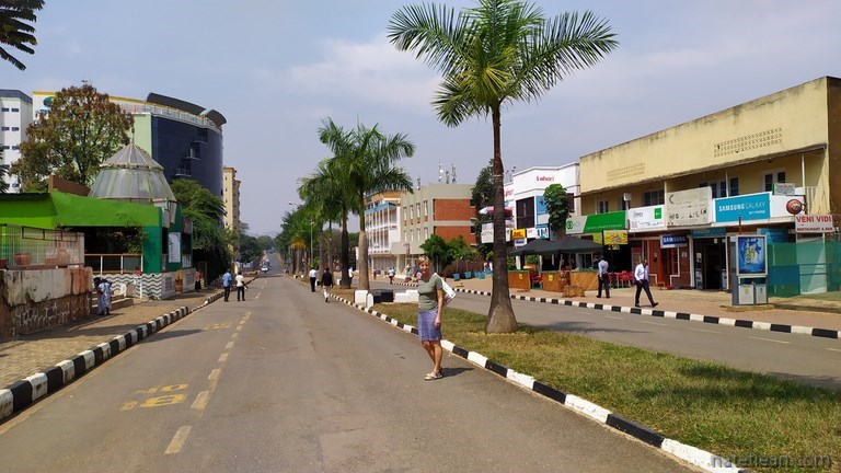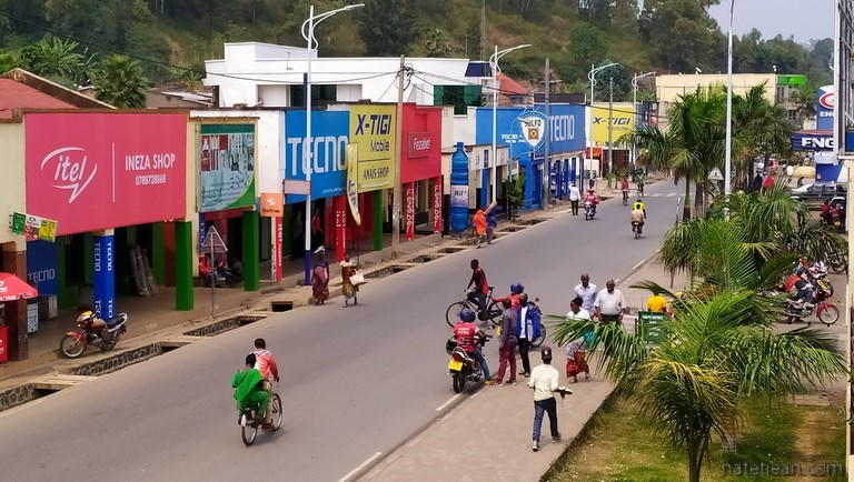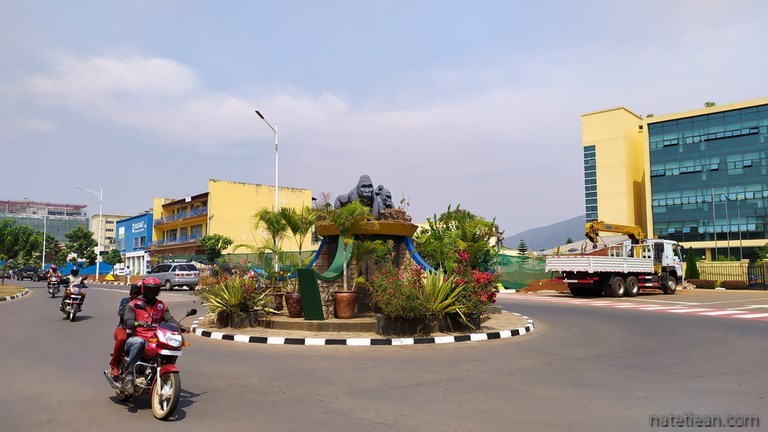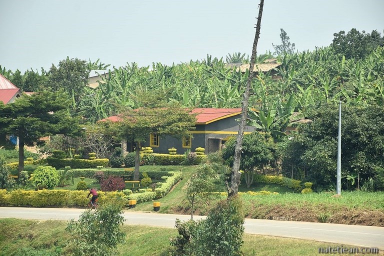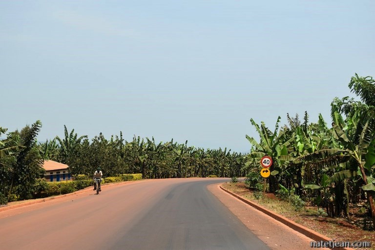 Les premiers kilomètres de route sont en construction mais, très vite, l'asphalte remplace la terre et l'on est surpris par l'excellence de la route, par sa propreté (du personnel balaye les bas-côtés en permanence, retirant même les feuilles mortes) et par la qualité des ouvrages ; c'est fait pour durer. Tout de suite après la frontière, on achète une carte sim pour avoir Internet, on retire de l'argent à un distributeur et on se réapprovisionne en fruits et légumes ; en quelques minutes, on a tout ce qu'il nous faut. Pour l'instant, tout nous semble facile au Rwanda. Pourvu que cela dure.