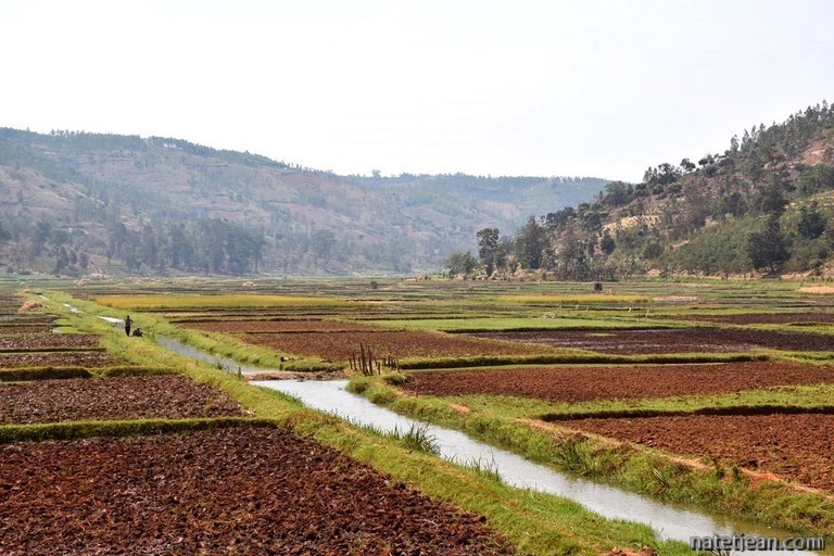 Nous reprenons la route le lendemain pour traverser le parc national de Nyungwe. Avant d'y arriver, nous traversons encore de beaux paysages à quelquefois plus de 2500 m d'altitude. Les bananeraies et les rizières se mêlent maintenant aux caféiers.