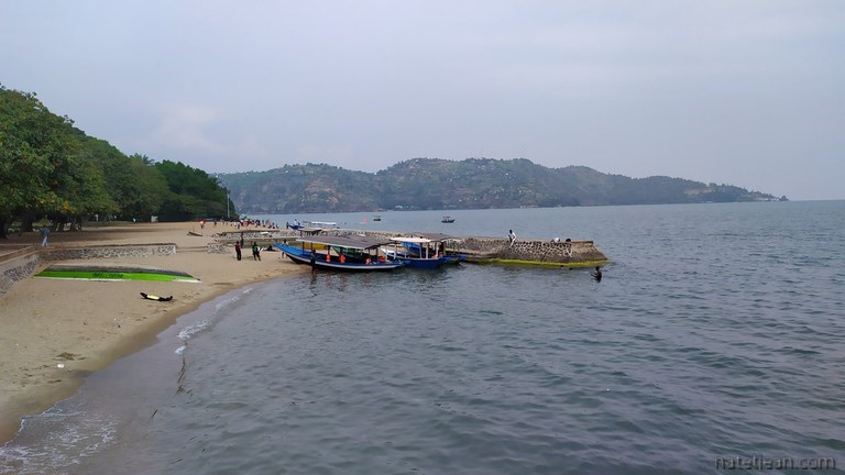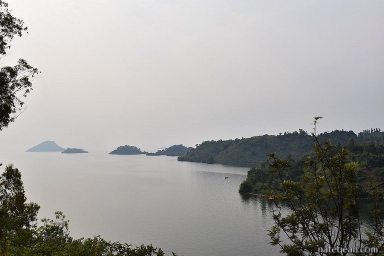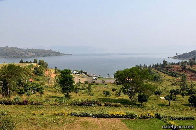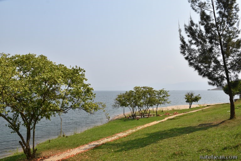 Nous partons ensuite au bord du lac Kivu, à Kagano, dans le district de Nyamasheke. Le lac, long de 89 km, fait frontière entre le Rwanda et la République Démocratique du Congo. Situé à 1460 m d'altitude, la route qui surplombe le lac est elle aussi haute en altitude et offre des points-de-vue époustouflants. A Kagano, nous choisissons de nous arrêter au Ishara Beach Motel qui dispose d'une petite plage de sable. Nous y restons le temps du week-end. Quelques Rwandais viennent également profiter de ce bel endroit pour se baigner et pour passer le samedi ou le dimanche en famille et quelques mariés pour se faire prendre en photo. Dans l'après-midi, nous partons faire quelques courses au village de Nyamashake à pied. Nous avons déjà remarqué qu'en Afrique les gens marchaient tout le temps ; les routes servent aux véhicules mais surtout aux gens pour se déplacer à pied et, au Rwanda comme ailleurs, les gens marchent car peu ont des voitures et peu peuvent payer un bus ou une moto-taxi ou même une vélo-taxi lors de leurs déplacements quotidiens. Pour une fois, nous les accompagnons pendant plusieurs kilomètres. Ils sont surpris de nous voir marcher et se demandent bien ce que nous faisons là. Nous aussi d'ailleurs puisqu'à Nyamashake il n'y a rien à acheter. En revenant, puisqu'on n'a pas trouvé de quoi manger, on déjeune au restaurant de l'hôtel, brochette de chèvre et de poisson, un régal qui ne coûte presque rien.