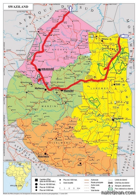 Nous n'avons pas prévu de rester très longtemps au Swaziland mais, nous avons déjà réservé, par email, 2 nuits dans le parc national de Hlane et 2 nuits dans le Mlilwane Wildlife Sanctuary, 2 réserves animalières. Le premier parc se trouve non loin de la frontière mozambicaine et le second est à l'ouest, près de la frontière sud-africaine.