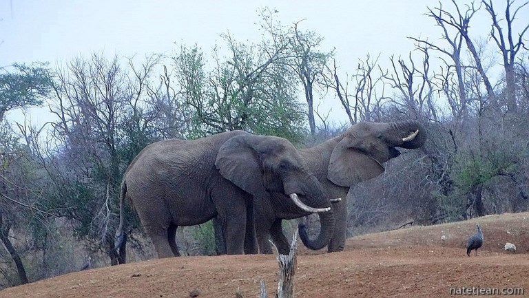 Malgré la forte chaleur que nous subissons presque 40°C, visiter Hlane est un véritable plaisir. Se prélasser devant le plan d'eau l'est encore plus; les animaux sont tout proches de nous, séparés seulement par des fils électriques. A la tombée de la nuit, les animaux sont plus nombreux à venir s'y abreuver. Un soir, un éléphant en furie nous effraye au point que nous devons détaler au plus vite laissant en plan toutes nos affaires. Nous ne nous étions jamais sentis autant en danger face à un éléphant. D'habitude, nous sommes protégés par notre véhicule.