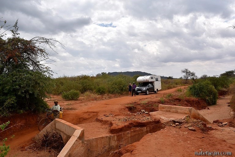 Le lendemain matin, la piste en terre menant à ce bivouac étant en bon état, nous décidons de l'explorer d'avantage et de nous rendre, en direction de la frontière kenyane, au lac Jipe à environ 25 km de là. Tant que nous sommes sur la piste, tout se passe bien mais lorsque nous décidons de rejoindre les bords du lac, la piste devient moins praticable et aboutit à un village cul-de-sac. En voiture, il ne semble pas possible d'aller plus loin et de rejoindre la rive. Enfin nous, nous ne voulons pas tenter l'expérience. Nous essayons donc de retourner sur la piste principale par un autre chemin. Celui-ci est étroit mais correct. Au moment où j'annonce à Jean qu'il ne nous reste plus que 200 m pour enfin rejoindre la piste, un petit pont écroulé nous empêche de continuer. Zut alors ! Petit demi-tour et un autre chemin encore plus étroit pour arriver à la route et ça passe. Ouf ! Et nous revoilà à notre point de départ pour une seconde nuit au bord de la rivière.
