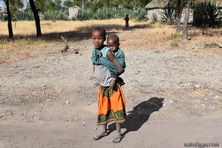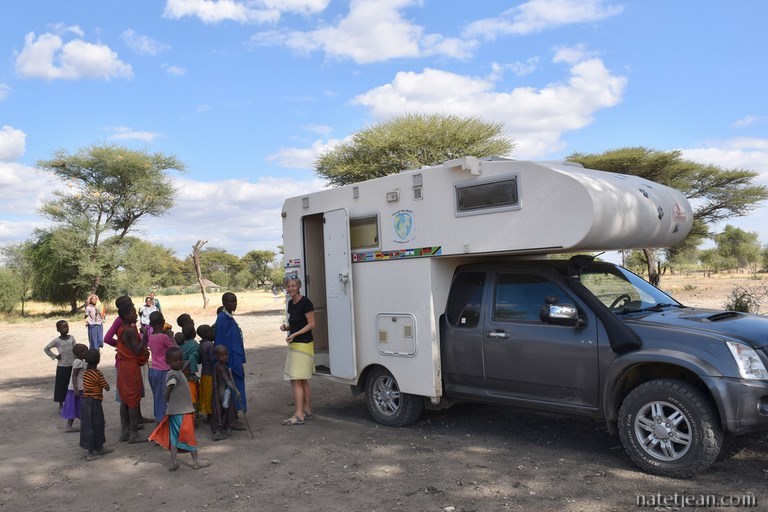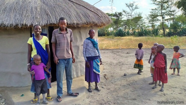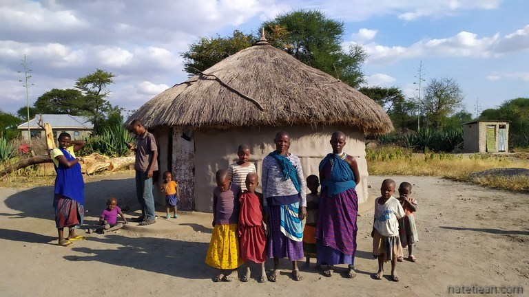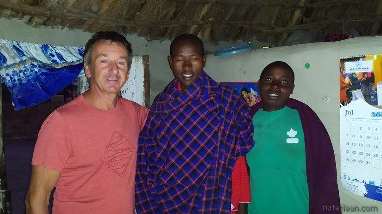 Un peu plus tard, alors que nous sommes à l'entrée du parc national Tarangire, nous nous arrêtons dans un petit village massaï pour y passer la nuit. Nous nous adressons aux habitants pour leur demander la permission de rester mais, comme personne ne parle anglais et que nous ne parlons pas la langue du pays, le swahili, nous ne nous comprenons pas. Une femme nous fait visiter sa case pensant que nous lui demandons l'hospitalité. Elle est très déçue lorsqu'elle s'aperçoit que nous dormirons dans notre camping-car. Arrive ensuite un villageois qui connait 3 ou 4 mots d'anglais et qui insiste pour que nous nous garions à côté de sa case, ce que nous faisons. Il installe 3 petits tabourets et nous finissons l'après-midi assis ensemble tout en parlant sans se comprendre. A la nuit tombée, un habitant, Isaac, parlant anglais vient nous trouver et nous confirme que nous pouvons rester. Il nous demande une petite somme d'argent pour la personne qui nous a accueillis puis il nous emmène chez lui pour nous présenter sa femme Ana et visiter sa case.
