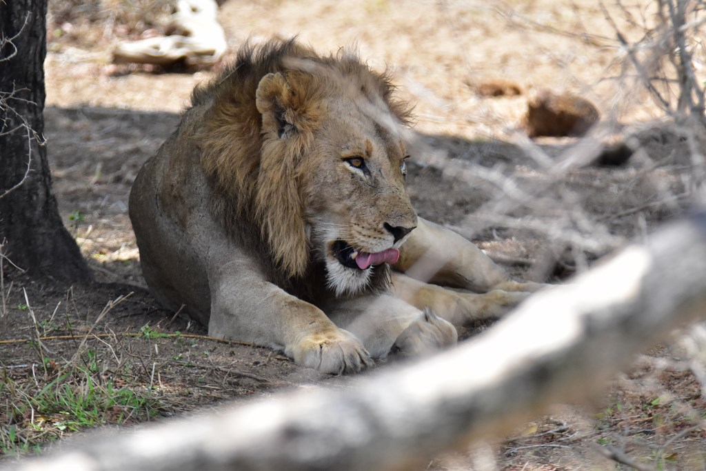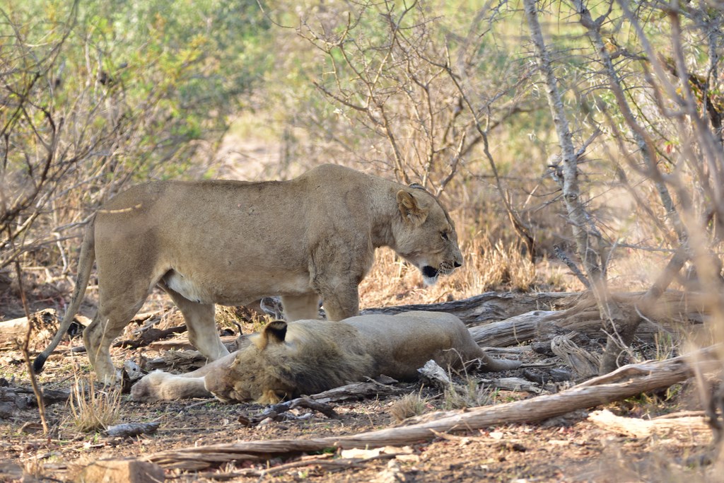 Après une nuit passée dans un charmant camping d'Hasyview, nous retournons voir les 2 lions que nous avions vus la veille. La girafe qu'ils ont tuée étant une grosse bête, il leur faudra certainement encore une journée pour s'en rassasier. Nous les retrouvons à la même place ou presque car l'un d'eux se balade maintenant d'un côté à l'autre du sentier passant même devant notre camping-car. Que demander de plus ? Nous n'irons pas plus loin aujourd'hui, les seuls lions nous suffisent. Nous en gardons pour les prochains jours.