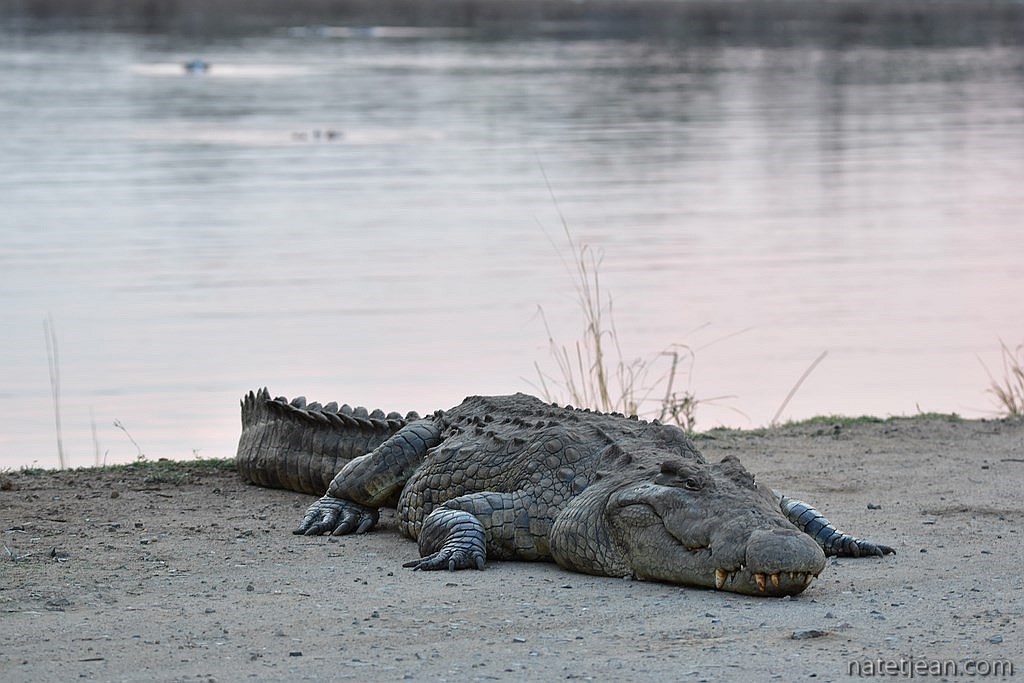 Le lendemain, nous nous levons à 5h pour être dès l'ouverture dans le parc. Notre 2ème étape nous conduit jusqu'au camp de Crocodile Bridge par des pistes logeant la rivière Crocodile. A peine sommes-nous arrivés dans le parc que nous croisons une meute de lycaons; il y en a une quinzaine sur la route. Eléphants, zèbres, girafes, koudous... les animaux habituels nous accompagnent tout au long de la journée. Dans l'après-midi, nous montons jusqu'au camp de Lower Sabie par la route puis redescendons par la piste à Crocodile Bridge. En cours de route, nous nous arrêtons dans un affût où nous dominons un point d'eau fréquenté par plusieurs éléphants; nous pouvons presque les toucher. Nous restons longtemps sur place oubliant presque que la nuit tombe très vite et que nous devons être au camp avant 18h. D'autant qu'en route, 2 hyènes et 1 guépard nous font perdre un peu de temps, ce qui est plutôt agréable et qu'un vilain bruit provenant du bas du véhicule nous fait ralentir, ce qui est plutôt inquiétant.