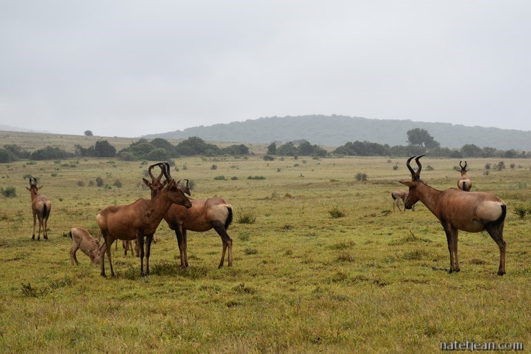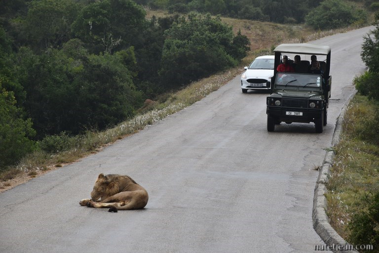 Comme il pleuvine, nous ne savons pas si nous verrons beaucoup d’animaux à Addo. Cependant, malgré ce mauvais temps, nous avons la chance de croiser des éléphants, des zèbres, des antilopes et des buffles et la très grande chance de voir se prélasser un superbe lion sur notre route. Pendant de longues minutes, il se tortille dans tous les sens pour le plaisir de quelques visiteurs qui, comme nous, ont eu la chance de passer au bon moment.