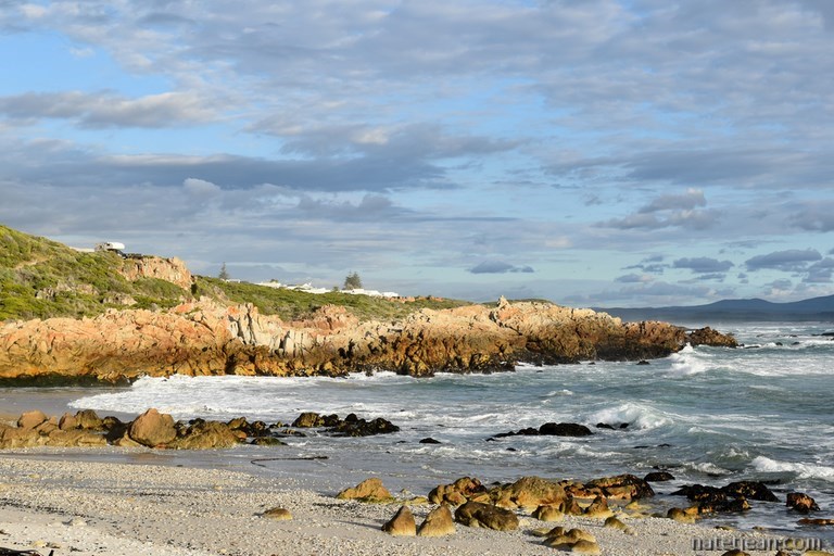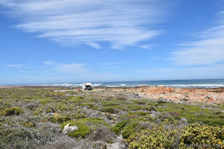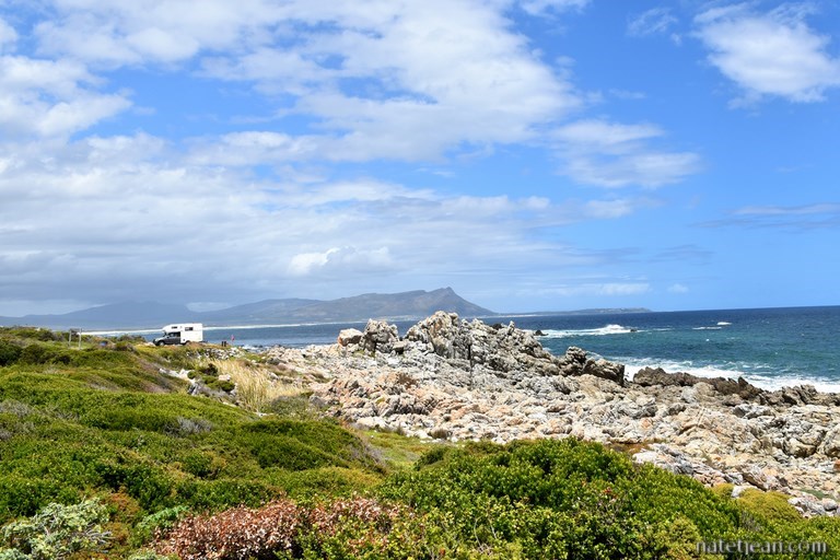 Nous nous arrêtons ensuite à Hermanus. Après une balade et un déjeuner au restaurant dans le centre-ville, nous longeons la route côtière où nous trouvons un bel emplacement où bivouaquer, Lansbaai Beach, dans un des quartiers résidentiels d'Hermanus. C'est encore une fois un point de vue sur l'océan, le long du Cliff Path, une promenade de 10 km longeant la mer. Dans cette ville touristique chic, c'est un endroit qui vaut de l'or; en-dessous, une petite crique de sable blanc, un peu plus loin la plage de Kammabaai où nous passons la journée et devant nous la mer et ses baleines de Biscaye qui de juin à décembre fréquentent la Walker Bay.
