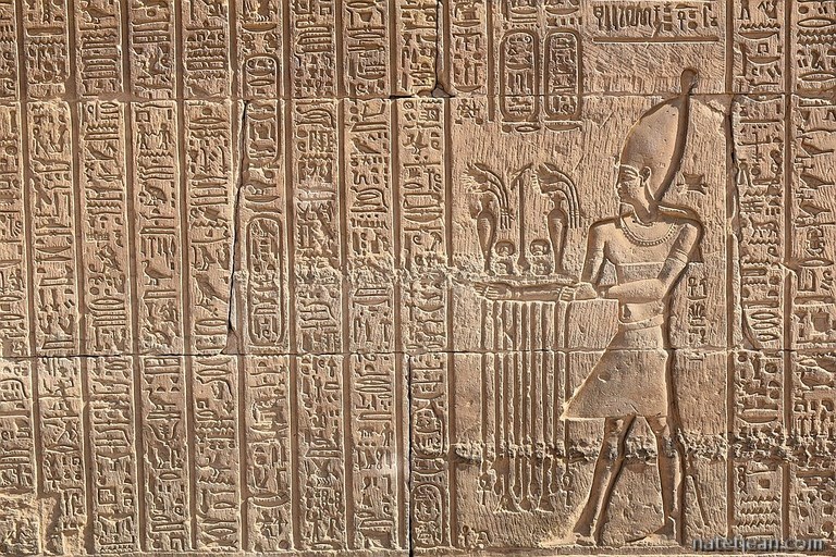 Après la visite de la matinée, nous continuons notre route vers Edfou. Nous y visitons le temple dédié au dieu Horus qui date à peu près de la même période que ceux de Kom Ombo. Le temple est situé en plein cœur de la ville ce qui, bien sûr, est un peu moins grandiose comme emplacement que celui des précédents temples mais qui n'enlève rien à la beauté du monument.