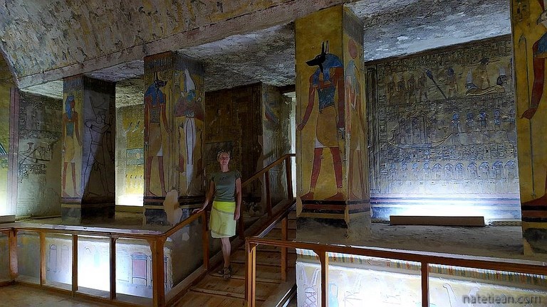 Le lendemain, nous nous rendons, en camping-car, dans la Vallée des Rois qui se trouve sur l'autre rive du Nil où nous visitons quelques tombes (3 comme l'autorise le ticket d'entrée) puis le temple d'Hatchepsout.