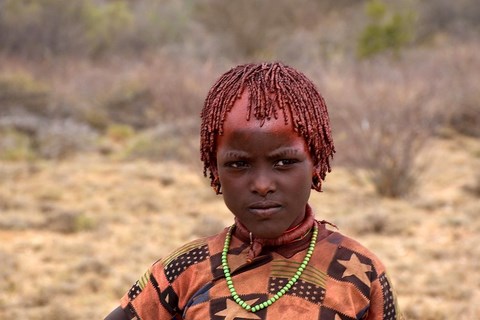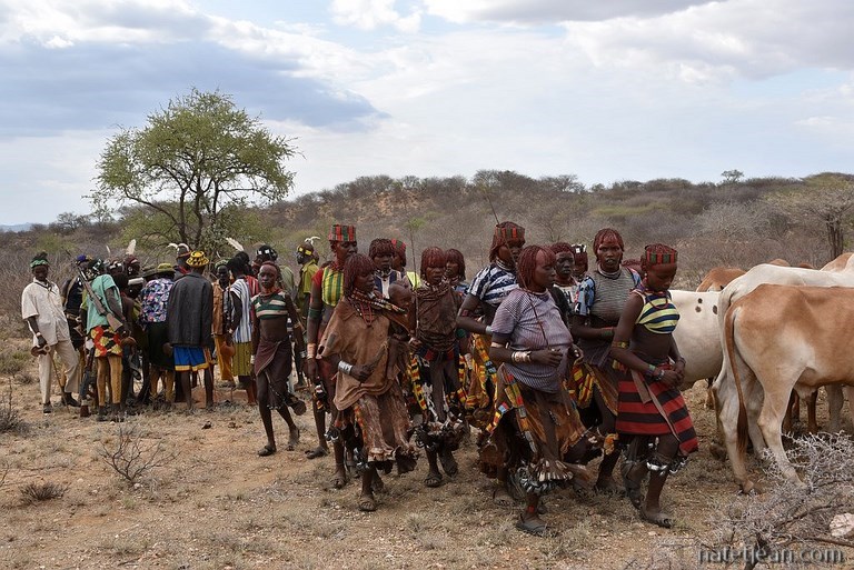 La vallée de la rivière Omo, très isolée au sud-ouest du pays, est habitée par 16 tribus différentes. Au sud, vivent les Hamer, une tribu très particulière dans son mode de vie et dans son apparence. Pour les rencontrer, nous prenons la direction du village de Turmi en direction du lac Turkana près des frontières kenyane et sud-soudanaise. Notre guide Petit Futé (qui justement ne l'est pas trop ...futé) nous indiquait une nouvelle route asphaltée jusqu'à Turmi. En réalité, à partir de Key Afer, la fameuse route qui a bien des trous se transforme en piste qui, elle aussi, n'est pas très reposante. Nous arrivons à Turmi vers midi et alors que nous sommes attablés pour déjeuner, un guide nous aborde pour nous proposer d'aller voir une cérémonie traditionnelle hamer, le oukouli ou "Bull Jumping".