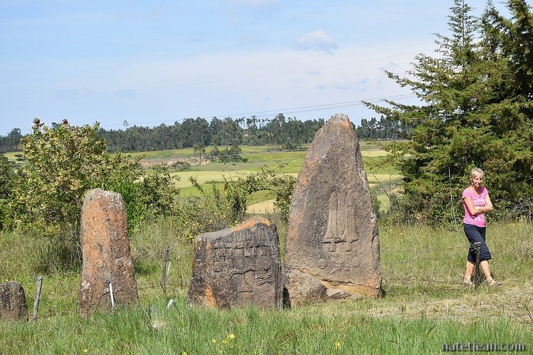 De l'empire axoumite, fondé entre le Ier et le IIIème siècle de notre ère et qui connut son apogée au VIème siècle, demeurent des vestiges tels que des stèles et obélisques sculptées dont certaines dépassent 25 mètres de haut, un ancien palais, Dungur (palais de la reine de Saba), un bassin (piscine de la même reine), une pierre, la pierre du roi Ezana, dont les inscriptions sont en 3 langues, grec, sabéen et guèze et des tombes de 2 rois, celle du roi Kaleb et celle de son fils Gabra Masqal. Après avoir passé la nuit sur le parking de l'hôtel Africa, nous débutons les visites. Tout, à part le palais Dungur que nous visitons en quittant la ville le lendemain, se trouve à proximité du centre-ville. Cela nous permet de nous déplacer à pied ce qui est d'autant plus agréable que la ville d'Axoum est charmante. Il y a comme ailleurs en Ethiopie beaucoup de restaurants et bars et beaucoup d'animation. Il est rare que nous ayons l'occasion de sortie le soir alors pour une fois on en profite. Cependant, alors que nous nous promenons, nous sommes surpris de voir que des militaires surveillent la ville. Nous n'avions pas remarqué de présence militaire spéciale ailleurs. Renseignements pris, nous apprenons qu'un peu partout dans le pays, le premier ministre, Abiy Ahmed, tout nouveau Prix Nobel de la Paix, a envoyé des forces militaires suite à des émeutes ayant eu lieu il y a 2 jours dans la région de l'Oromia et ayant fait plus de 60 morts. L'Ethiopie, avec sa diversité ethnique, n'est pas un pays stable et quand on sait que l'un des accessoires de mode des hommes éthiopiens est la kalachnikov en bandoulière, on pourrait se sentir craintifs et pourtant, tout semblant calme à Axoum, on ne parvient pas à s'inquiéter.