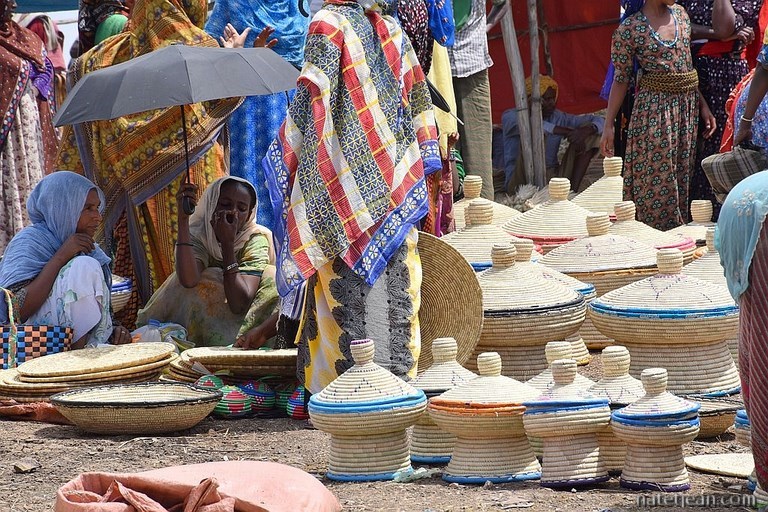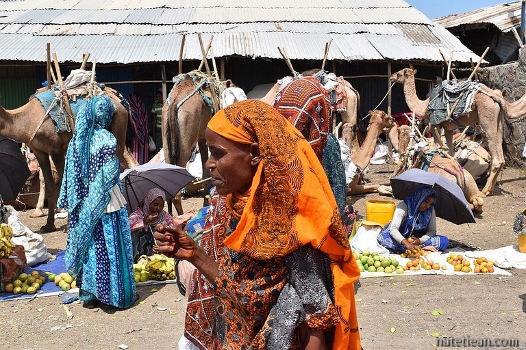 Le lendemain, après une heure de route, nous arrivons à Bati. Nous sommes surpris d'y être plusieurs fois apostrophés en français. L'explication est que nous ne sommes pas très loin de Djibouti et qu'il y a pas mal de Djiboutiens de passage ou même installés dans la ville. Avant de faire la visite du marché, nous prenons le temps de boire un bon café éthiopien dans le stand de rue devant lequel nous sommes garés. En plus de faire une pause, cela nous permet de faire connaissance avec les femmes qui s'occupent des échoppes et de leur confier, l'air de rien, le véhicule à surveiller. Le marché de Bati est fréquenté par les populations Oromo, Amhara et Afar et c'est là le principal attrait pour nous car en dehors des gens, ce qui y est proposé à la vente n'est que pacotille, ustensiles usuels à la vie quotidienne ou bétail. Partout, les gens sont charmants. Contrairement à ce que nous ont habitués les Ethiopiens, ici, personne ne réclame ou ne mendie même lorsque nous prenons des photos. Un vendeur de parapluies insiste même pour nous prendre en photos avec un de ses articles. Après midi, alors que le marché bat son plein, nous refaisons la route en sens inverse, retraversons Kombolcha et nous arrêtons à Dessié sur le parking du Awash Greenland Hotel (zéro pointé !) pour y passer la nuit.