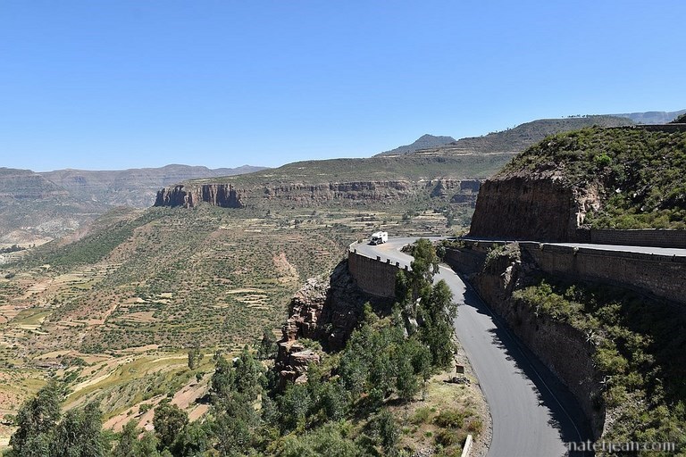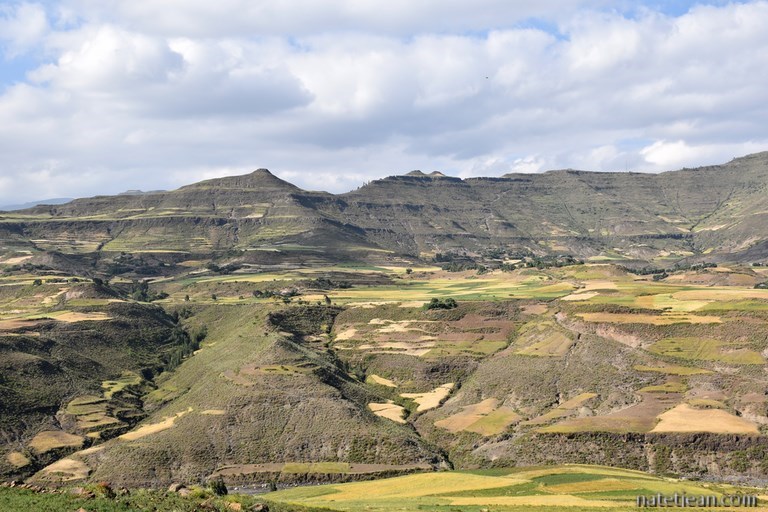 Au réveil, nous prenons le temps d'admirer le magnifique paysage ainsi que la route vertigineuse que nous avons empruntée la veille. Il nous reste encore 12 km à faire avant d'arriver à Debark et avant de retrouver une bonne route. En attendant, la pluie a creusée la piste et c'est au pas que Jean enchaîne les épingles. Passé Debark, nous suivons, pendant 40 km, la route traversant un plateau situé à 2700 mètres d'altitude. Ici, comme partout en Ethiopie, pas une parcelle de terrain qui ne soit cultivée, le tout formant un patchwork de jaune, orange, vert, les couleurs des céréales (sorgho, blé, tef, etc...), principales cultures que l'on trouve en Ethiopie. Comme tout est cultivé, les bêtes, très nombreuses, sont privées de pâturages et se retrouvent le long des routes et même sur les routes et nous accompagnent tout le long de nos trajets. C'est très pittoresque !