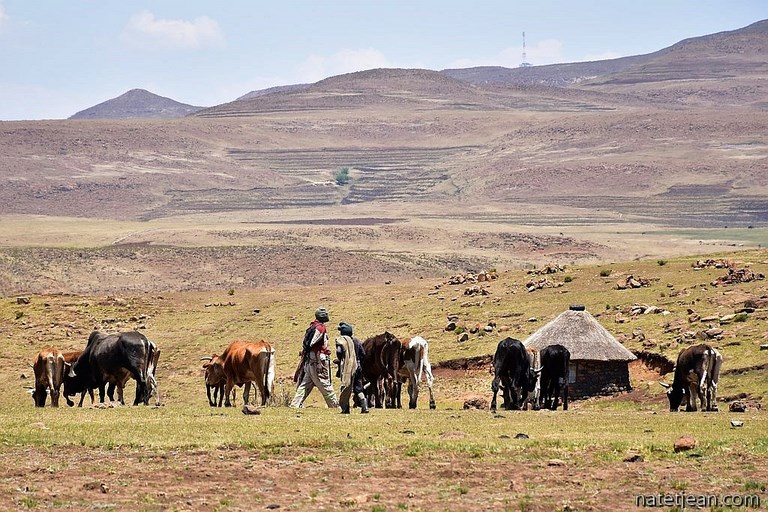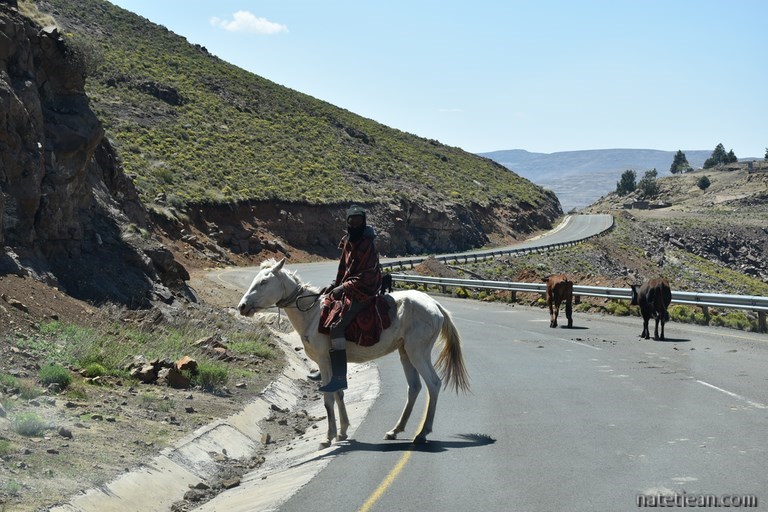 Hormis la traversée de la ville de Roma, nous ne croisons que des bergers et leurs maigres troupeaux de vaches ou de moutons sur une centaine de kilomètres. Certains bergers sont à cheval, la plupart sont à pied. Malgré la chaleur, tous sont couverts d'une épaisse couverture, attirail vestimentaire très répandu au Lesotho.