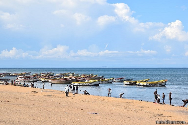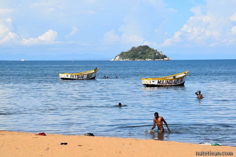 Nous descendons ensuite vers le lac, à Nkhata Bay. Nous sommes un peu déçus par le village et le bord du lac peu accessible en camping-car. Nous décidons alors de poursuivre notre route jusqu'à Chintheche où là, nous trouvons un camping agréable les pieds dans l'eau, le Sunga Moyo Lodge. Le lac Malawi est un des plus grands lacs d'Afrique, long de 570 km et large de 75 km, il mesure près de 30'000 Km2. C'est presque une mer intérieure et d'ailleurs, lorsqu'on l'aperçoit, c'est l'impression qu'il donne. Aujourd'hui, pas de baignade car le temps est gris alors on se repose et on joue sur la plage avec un ballon artisanal en latex que nous avons acheté sur la route dans la région des plantations d'hévéas.