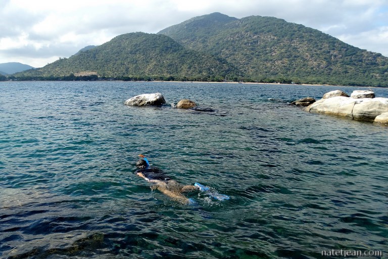 Le lendemain de notre arrivée, nous embarquons pour une petite croisière en bateau à moteur autour de West Thumbi Island. Le lac Malawi est réputé pour ses petits poissons colorés et l'île est un des beaux endroits pour faire du palme-masque-tuba. L'eau particulièrement claire nous permet de voir beaucoup de poissons de toutes les couleurs. Dans les airs, nous apercevons plusieurs aigles marins que notre guide attire avec des poissons qu'il a achetés aux pêcheurs du lac que nous avons croisés. Grâce à lui, les aigles plongent à quelques mètres de nous. C'est un superbe spectacle encore plus enthousiasmant que le snorkeling.
