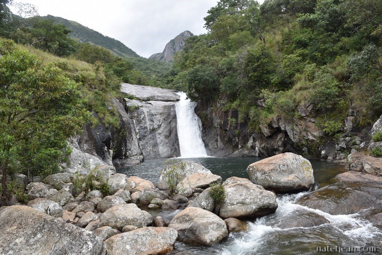 En milieu de journée le lendemain, nous partons faire une balade jusqu'à Queens View (du nom de la reine mère) et Emperor's View (de celui de Haile Selassie I), 2 très beaux points-de-vue sur Zomba et sa région. La montée qui part du dam est assez raide pendant 1 km puis elle devient très agréable lorsqu'on atteint le plateau à 1750 m d'altitude. La première partie n'est pas balisée et il est indispensable de disposer d'un GPS pour s'orienter (merci MapsMe) ensuite, le chemin est large et les points d'intérêts sont indiqués. Nous pique-niquons aux Williams Falls qui se trouvent en contrebas puis nous rejoignons le parking du barrage où se trouve notre camping-car. Avec un petit détour jusqu'aux échoppes de souvenir de l'hôtel Sunbird se trouvant au bout de la route, cela fait une très jolie balade d'environ 13 km. Le soir, nous nous parquons à quelques mètres de notre précédent bivouac sur une aire de pique-nique au bord de l'étang devant la jolie cascade Mandala. Nous dégustons les fruits de la passion et les baies que nous avons achetés aux vendeurs du coin. Un délice! La région est une véritable corne d'abondance, on y trouve tous les légumes et tous les fruits. Au Malawi, il faut manger local. Ne pas vouloir manger selon ses désirs mais prendre ce que l'on trouve en fonction de la saison et de la région. On a un peu de mal à s'y faire mais, en principe, si on ne se plie pas à cette règle on paye plus cher et surtout, on est déçus par la qualité du produit.