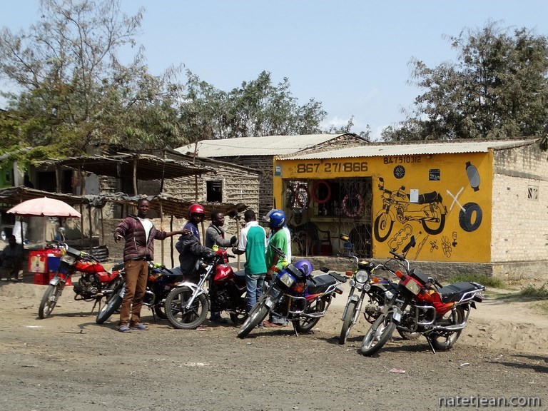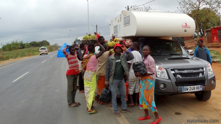 A quelques kilomètres de Muxungue, nous avons trouvé un emplacement tranquille, un petit terrain de foot sous les cocotiers. Pas mal pour un premier bivouac, sachant que nous ne sommes pas très regardants quand il s'agit de journées passées à rouler. C'est sans compter sur un groupe de militaires qui viennent nous déloger et nous imposent d'aller nous garer dans le village. On ne comprend pas si c'est parce que nous sommes chez eux ou si c'est pour notre sécurité; on essaye bien de les convaincre mais en vain. La nuit est maintenant tombée et nous devons retourner à Muxungue. Malheureusement, depuis que nous avons rejoint la route N1, il y a quelques trous et nous devons être très vigilants car on a vite fait de se faire piéger.