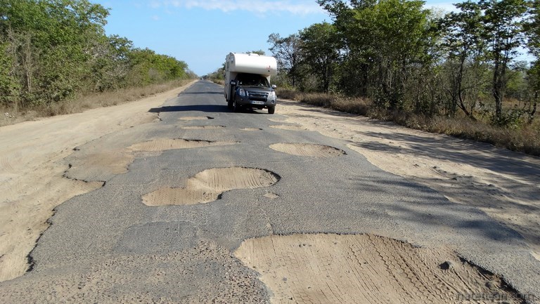 La route est relativement en bon état puis, sur environ 200 km, elle se dégrade; il y a des trous partout. Nous roulons au pas. Heureusement, il n'y a peu de circulation et nous pouvons avancer à notre allure sans tenir compte des autres véhicules qui risqueraient de nous percuter lorsque, surpris, nous sommes contraints de piler devant un trou.