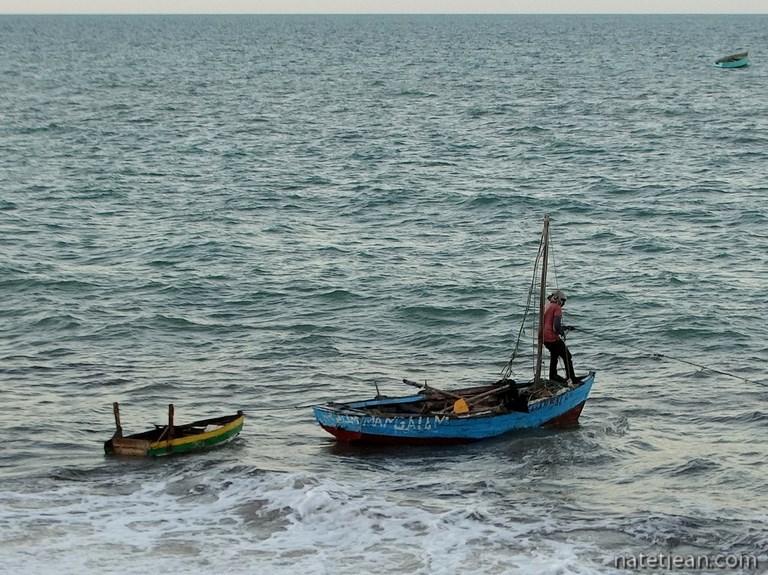 A 6h00, nous embarquons avec Peter et Verne sur un bateau à moteur. Le skipper navigue à vive allure pendant 25 km puis s'arrête au milieu de l'océan. Peter prépare alors les cannes à pêche et nous attendons que le poisson morde mais, rien... Ce n'est pas le bon endroit; l'eau y est un peu trouble. Nous repartons pour 10 km. Peter réinstalle le matériel. Quelques minutes plus tard, il m'appelle; ça mord déjà, du gros. Il me met la canne entre les mains et à moi de remonter le poisson. Dur, dur, quand on ne connait pas la technique. Lorsque le poisson arrive en surface, Peter reprend la canne en main car je n'en peux plus. Ça s'appelle aussi pêche sportive et ce n'est pas pour rien ! Peter remonte un thon de 8 kg. C'est ensuite au tour de Jean de pêcher un magnifique barracuda de 12 kg. Puis on alterne, pêchant chacun un autre barracuda. En tout, nous parvenons à prendre, à nous 4, 7 barracudas et 1 thon. Une pêche très chanceuse pour une première et une belle expérience.