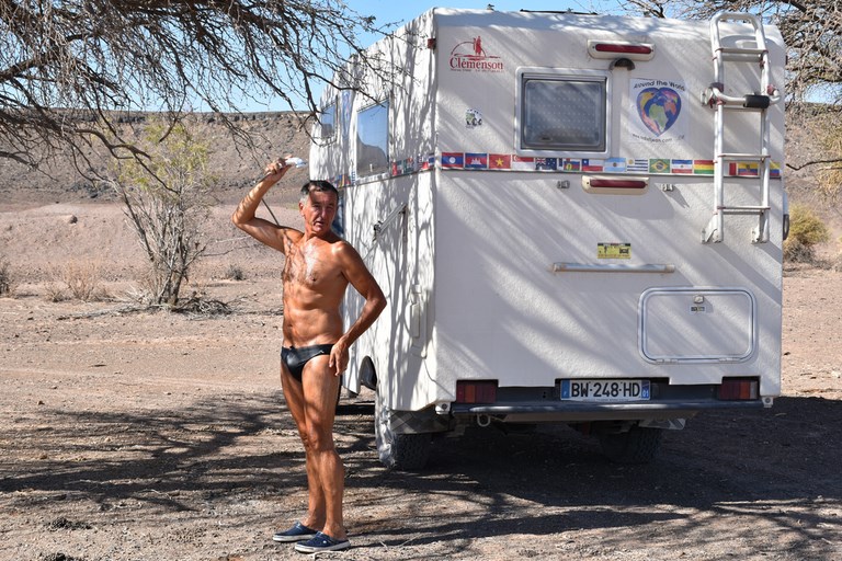Swakopmund est une ville de plus de 40'000 habitants et on y trouve tout, commerces, artisans, etc... Ici, les "Européens" vivent sur le même standard de vie que chez nous. Jean profite de notre arrêt pour faire faire quelques réparations sur le camping-car (pose de rivets sur un encadrement de porte d'un coffre, réparation du pare-brise que l'on a changé il y a 1 mois, changement d'un néon) et pour lui donner une petite touche africaine en ajoutant des pattes de lion sur le capot. Etrangement, c'est lorsqu'on est à l'arrêt que les journées passent le plus vite ; on essaye de se remettre en forme en allant courir, on se baigne dans une petite baie abritée où finalement l'eau n'est pas si froide que prévu, on planifie la suite du voyage et le soir, on partage nos repas avec Anna et Hubert, des voyageurs allemands. Ana et Hubert sont partis une première fois en 98 avec leurs 2 enfants en Amérique à bord d'un bus VW puis, après 3 ans de voyage, les enfants ont voulu revenir en Allemagne. Ils sont donc tous revenus mais, il y a 15 ans, les parents sont repartis et depuis, ils sont sur les routes. Leur vie se passe désormais ailleurs qu'en Allemagne où ils ne rentrent presque jamais. Contrairement aux autres voyageurs, ils restent très longtemps au même endroit et n'ont aucun plan pour la suite de leur voyage. En comparaison, alors que nous avons passé 3 mois en Inde, ils y sont restés 3 ans.