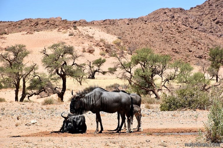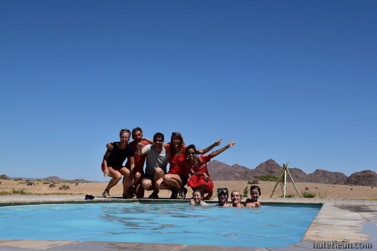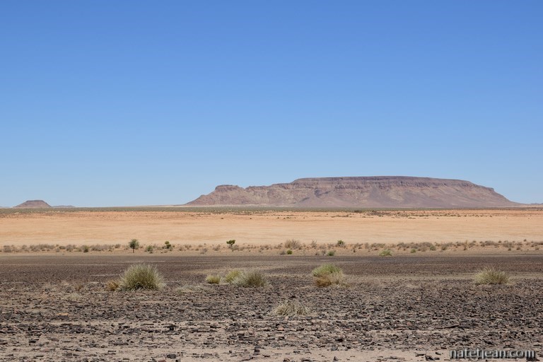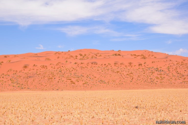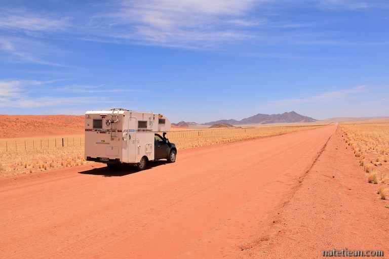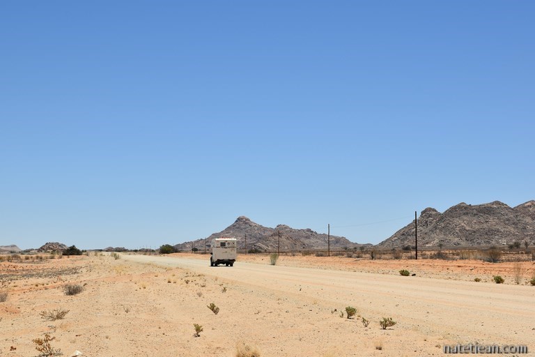 Le lendemain, nous partons en direction de Sesriem et des dunes de Sossusvlei. Nous empruntons la jolie piste 707 avant de rejoindre la C27. Les paysages sont aussi beaux que cette piste est mauvaise. La tôle ondulée nous fait zigzaguer d'un côté et de l'autre de la route avec l'espoir de suivre une meilleure trace mais, c'est peine perdue. En milieu d'après-midi, on arrive à Betta où se trouvent un petit camping avec piscine et une station-service. On en a un peu assez de la chaleur, du sable et surtout de la route alors on se pose là pour passer la soirée et une partie de la journée du lendemain.