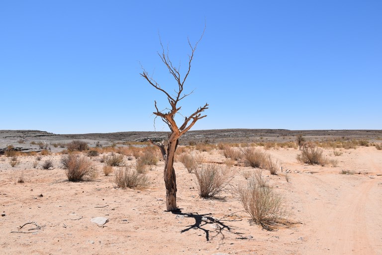 Le diagnostic étant fait, il faut maintenant se faire dépanner. Nous ne sommes qu'à 800 mètres de la piste; je la rejoins pour trouver de l'aide. Après 1/2 heure d'attente, une voiture apparaît enfin. Ce sont des touristes français et allemands; je retourne avec eux jusqu'au Cañon Road House. De là-bas, un employé me ramène au bivouac où Jean redémarre le véhicule avec la batterie de celui venu nous dépanner mais, il n'y a aucun doute, la batterie est morte. Nous n'avons d'autre choix que de rejoindre une ville pour en acheter une nouvelle. Heureusement, à 130 km un peu plus au nord (c'est-à-dire à l'opposé d'où on allait), Keetmanshoop est une ville où on trouve tout. Dans la journée, le problème est résolu. Nous reprenons alors la direction de Fish River Canyon pour bivouaquer en bord de route dans le Gondwana Cañon Park. Alors que nous sommes posés depuis quelques minutes, Jean s'aperçoit qu'on a une roue crevée ; une pièce métallique de 2 centimètres a entaillé le pneu. Quelle journée ! Demain, retour à Ketmanshoop pour faire réparer le pneu.