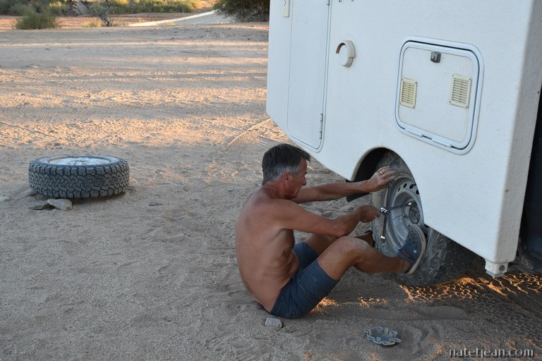 Cette fois, avant de s'occuper du pneu, Jean tient à régler le problème du filtre gasoil défectueux car, tous les matins, ne pas savoir si oui ou non on va démarrer commence à nous agacer. De plus, si, une nuit, nous sommes en danger et que nous devons partir rapidement, on ne le peut pas. A Upington, en Afrique du Sud, qui est pourtant une grande ville, le diéséliste que nous avions sollicité avait été incapable de nous trouver un nouveau filtre; à Keetmanshoop qui est une toute petite ville, le garagiste chez qui nous emmenons le camping-car nous en trouve et le change en adaptant le support en peu de temps. Quant au pneu, un réparateur colle un patch à l'intérieur pour colmater le trou. Cela devrait tenir.