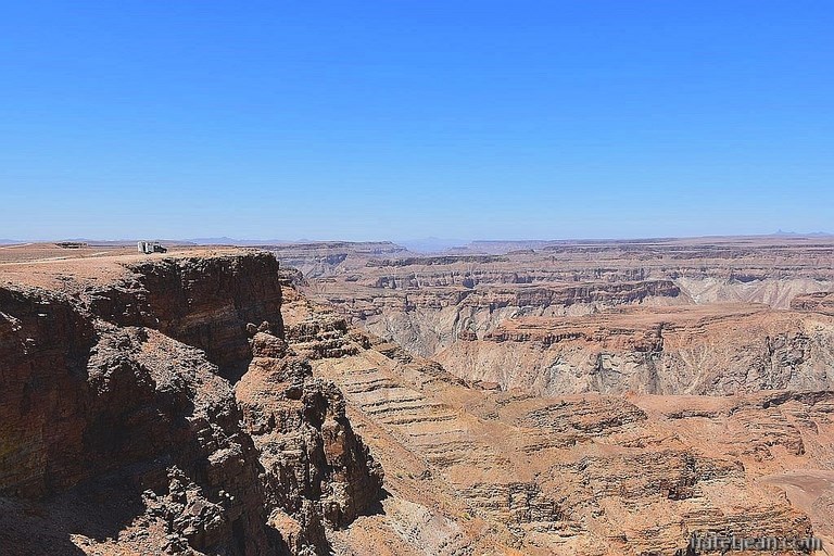 Cela semblait mal parti mais on finit par y arriver à ce fameux canyon de la Fish River et ça vaut le coup. Le panorama est grandiose. Quelques points-de-vue, que l'on parcourt en véhicule, sont aménagés le long du canyon à une dizaine de kilomètres de l'entrée du parc. A cet endroit, le fleuve ou plutôt le lit du fleuve car il ne reste que quelques gouilles d'eau, forme des méandres à plusieurs centaines de mètres au-dessous de nous. La roche, le sable, le vide, le soleil de plomb, ici, le désert est infini.