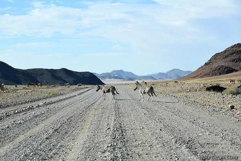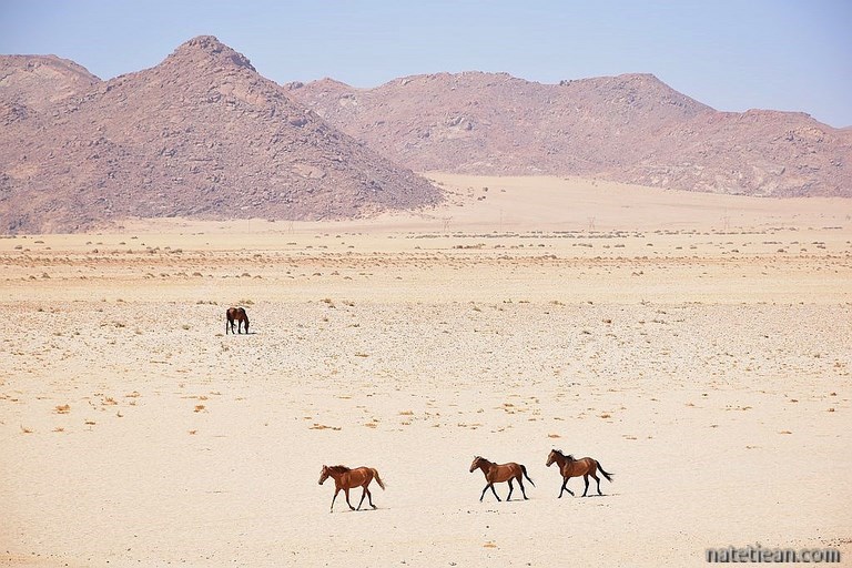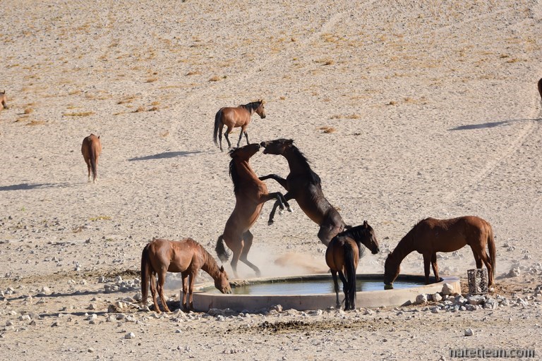 A Rosh Pinah, nous retrouvons une belle route asphaltée qui rejoint, après 165 km, à Aus, la route principale B4. Le long de la route, nous apercevons quelques chevaux sauvages puis, à un point d'eau artificiel construit à Garub en retrait de la B4 plusieurs dizaines ; surtout le matin, entre 6h et 8h. Ils sont près de 50 à venir s'abreuver pour notre plus grand plaisir; nous avons bivouaqué sur place pour les attendre. Nous n'avons qu'à baisser le store de la fenêtre de notre chambre pour les voir. Autre plaisir ce matin, il fait 13°C. Hier déjà, la température n'avait pas dépassé les 35°C en milieu d'après-midi. Les prévisions météo des jours suivants indiquent qu'à Lüderitz, au bord de l'Océan Atlantique, elle ne devrait pas excéder 32°C. On est enfin sorti de la fournaise !