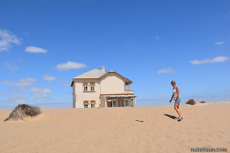 A Lüderitz, non seulement les températures sont agréables mais en plus, le temps est très ensoleillé et il n'y a presque pas de vent; ce qui est apparemment très rare. Nous en profitons pour visiter Kolmanskop, la "Ville Fantôme". Cette ancienne ville minière construite par les Allemands au début du XXème siècle et abandonnée depuis des décennies semble s'enfoncer petit à petit dans une dune de sable. Le sable entre par toutes les portes et fenêtres des anciens bâtiments, les baraques des ouvriers, celles des ingénieurs, les boutiques ou les ateliers... L'ancien casino-théâtre a été restauré et présente des objets et photographies retraçant la vie des habitants de Kolmanskop. C'est la vie... et la mort de ces villes sorties de terre lorsqu'un filon est trouvé et abandonnées aussitôt lorsque celui-ci est épuisé. Puis une autre ville est alors reconstruite un peu plus loin...
