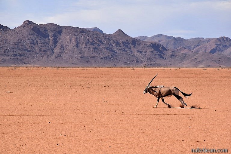 Le lendemain matin, 21°C au réveil. On profite un peu de la fraîcheur avant de reprendre la route vers Fish River Canyon. On traverse la petite ville de Karasburg, puis le lieu-dit Grünau constitué de quelques baraques éparses puis on attaque les pistes; d'abord la C12, puis la C37 qui nous fait entrer dans le Gondwana Cañon Park. Ce sont de bonnes pistes de terre un peu gravillonnées sans trop de relief. Nous y croisons des autruches, des oryx et des springboks et quelques voitures de touristes, sinon rien.