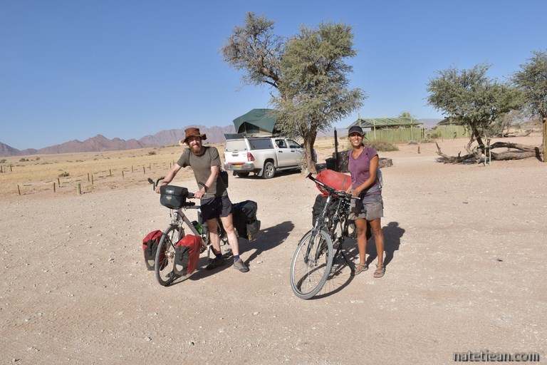 Au Sossus Oasis, nous faisons la connaissance d'un couple de cyclistes qui parti d'Allemagne, traverse maintenant l'Afrique sur le mythique tracé allant du Caire au Cap. Simon est allemand, Tanya est sud-africaine et l'idée de partir d'Allemagne pour rejoindre l'Afrique du Sud est tout un symbole.