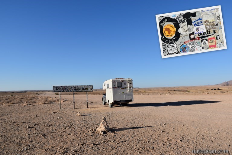 Il nous reste encore pas mal de kilomètres de pistes avant d'arriver à Walvis Bay. Entre les 2 étapes, nous dormons à l'emplacement où est signalé le Tropique du Capricorne, en bord de route et le lendemain, le 6 février, 8 mois jour pour jour, nous sommes de retour à Walvis Bay. Nous retrouvons les lieux que l'on connaît déjà, le front de mer et son restaurant The Raft où nous fêtons notre boucle africaine accomplie (Namibie, Botswana, Zimbabwé, Mozambique, Swaziland, Afrique du Sud, Lesotho et Namibie), la dune 7 où nous passons encore une nuit, le Dunes Mall, un centre commercial, où l'on est surpris par le luxe qui, venant tout juste d'arriver de France ne nous avait pas paru si clinquant mais qui, après avoir traversé plusieurs pays africains nous semble extraordinaire, les flamands roses, les pélicans, etc...