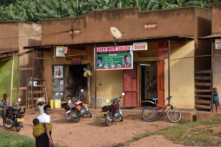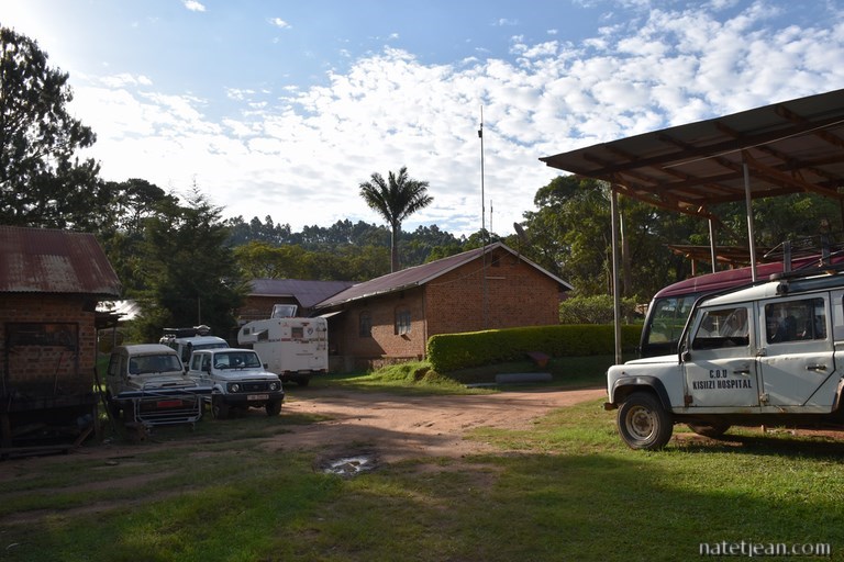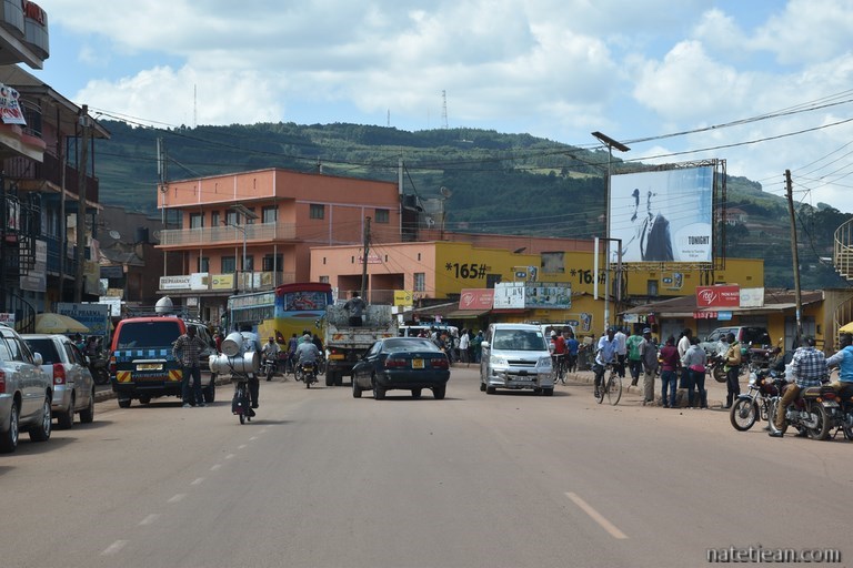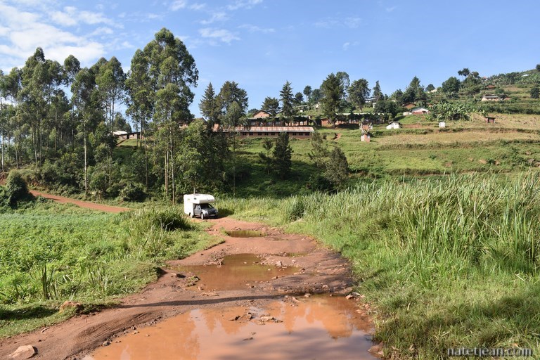 Lors de ce premier bivouac sauvage, tout se passe bien. Nous ne sommes pas dérangés et ne sentons aucune insécurité. Nous repartons tôt le matin pour nous rendre aux chutes de Kisiizi. Nous faisons quelques kilomètres sur la belle route asphaltée Kisoro-Kabale puis nous empruntons une piste conseillée par notre GPS. On roule pendant des kilomètres en suivant une trace qui se réduit de plus en plus. Il est bientôt impossible de croiser ; heureusement, nous ne rencontrons presque aucun véhicule, à part une ou deux motos. En plus d'être étroite, la route est escarpée, à flanc de falaise et évoluant à plus de 2000 mètres d'altitude. Au bout d'une heure environ, nous rejoignons une belle piste qui, nous le comprenons, aurait pu nous emmener jusqu'ici dans de meilleures conditions. Nous la croisons pour continuer par un petit chemin descendant très cabossé. C'est alors que je prends peur et que nous décidons de faire demi-tour, de revenir à notre point de départ par la belle piste et de rejoindre Kabale puis Rubaru où nous reprenons une piste mieux indiquée et un peu meilleure que la première. Cela nous fait faire un grand détour mais cela me rassure. Cela nous permet aussi de faire un arrêt dans un petit resto à la sortie de Kabale.