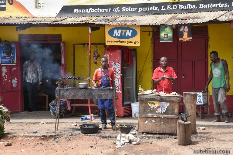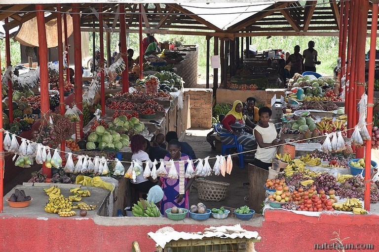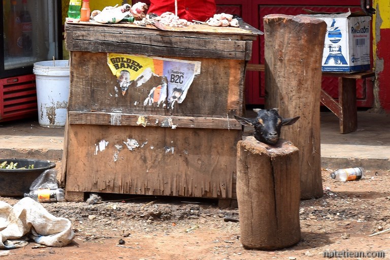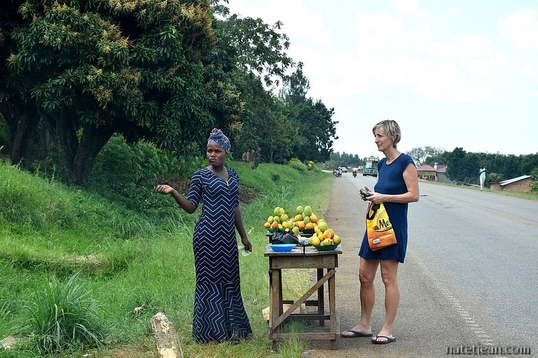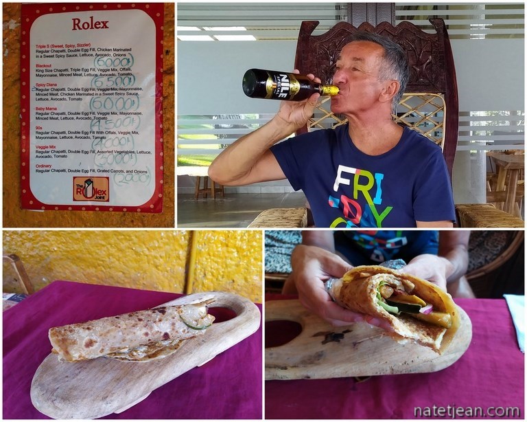 Nous ne passons qu'une journée au bord du lac Nkuruba puis nous partons à Fort Portal. Nous y faisons quelques courses, du pain, des fruits... il n'y a pas grand-chose dans les petites échoppes en Ouganda. Heureusement que nous avons fait de grosses provisions au Rwanda et que nous mangeons souvent au restaurant. Les plats dans les lodges ou bien dans les petits restaurants que nous fréquentons sont bons, toujours complets (viande ou poisson, légumes et féculents). On est servi en quantité et cela coûte très peu cher, de 5'000 à 15'000 Ush, soit de 1.20€ à 4€.