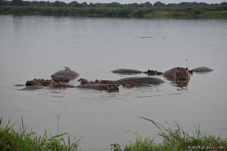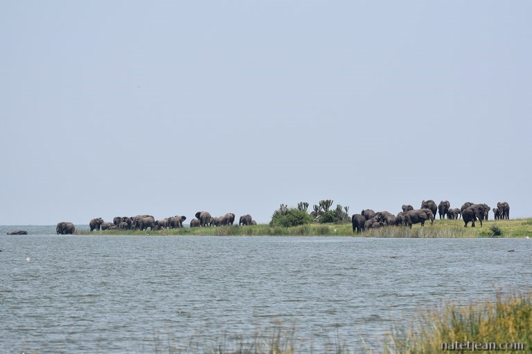 Avant de prendre la direction d'Ishasha pour aller voir les lions, nous faisons un détour jusqu'au village de Katwe au bord du lac Edward. Le long de la route, nous croisons plusieurs troupeaux de buffles et de cobes. Au bord du lac, peu avant Katwe, nous apercevons une harde d'une cinquantaine d'éléphants se désaltérant. En escaladant le talus, on s'approche d'eux et l'on voit qu'il n'y a pas que des pachydermes mais aussi des dizaines d'hippos et des crocos. Nous restons sur place pour pique-niquer lorsque d'autres éléphants approchent. Comme nous sommes sur leur chemin, nous nous déplaçons pour ne pas risquer de se faire chahuter mais il semble bien qu'ils nous ignorent.