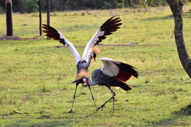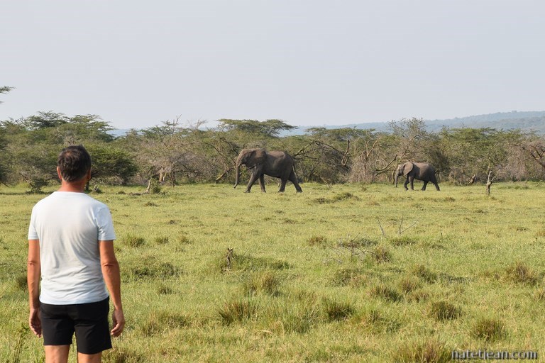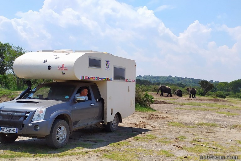 Le parc Queen Elisabeth n'est pas clôturé ce qui explique que l'on voit la faune sauvage partout, même sur la route principale. Au retour vers Katunguru, des éléphants traversent devant notre véhicule et lorsque nous arrivons au camp communautaire de Kisenyi, le Kisenyi Lake Retreat, pour passer la nuit entre Katunguru et Ishasha, d'autres éléphants nous y attendent encore. Dans la nuit, nous entendons le grognement d'un hippo et au petit matin des cobes et des grues gambadent autour de notre véhicule. On se demande bien ce que l'on peut voir de plus dans les réserves du parc !