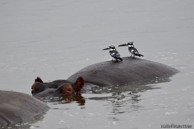 Hippos et martins-pêcheurs dans le lac George - plaines de Kasenyi - Queen Elizabeth NP