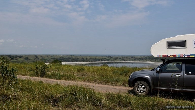 Peut-être pour la vue sur les cratères de Katwe, la dernière partie que nous traversons, qui est époustouflante. Nous rentrons sur la zone des cratères un peu avant midi. Notre billet n'étant valable qu'une heure, nous convenons avec la gardienne que nous irons jusqu'au premier point-de-vue puis que nous ferons demi-tour. Cependant, à mesure que nous avançons, nous nous apercevons qu'il sera impossible de faire demi-tour. Le chemin est très escarpé (nous suivons les crêtes des cratères) et on ne peut croiser car la piste et étroite et les bas-côtés profonds. Nous n'avons qu'une solution continuer. Comme nous ne voulons pas risquer de repayer un jour de plus, nous redescendons par un petit chemin débouchant sur la piste de Katwe que nous avions repéré 2 jours avant et qui ne possède pas de porte officielle. C'est un peu périlleux de ne pas suivre le chemin recommandé mais, on tente le coup et finalement, à part les centaines de mouches tsé-tsé qui veulent rentrer dans le véhicule pour nous piquer, l'option s'avère être la bonne.