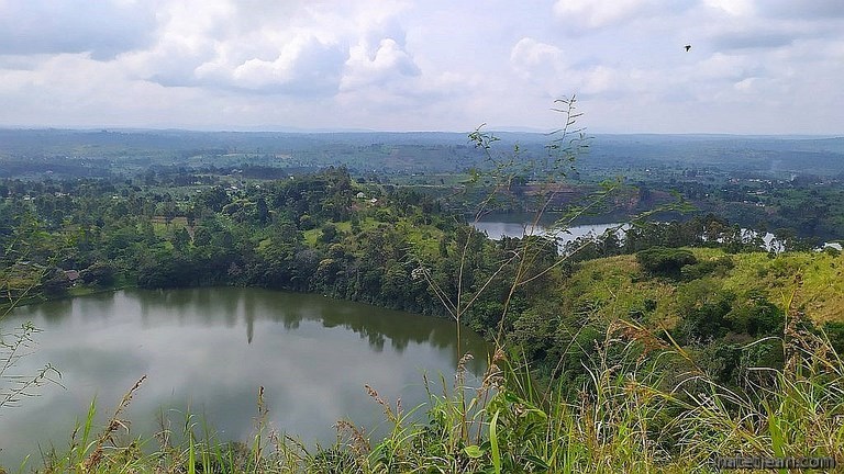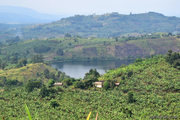 L'Ouganda, situé sur le rift est-africain (une faille de plusieurs milliers de kilomètres allant de la mer Rouge jusqu'au sud du Mozambique) est parsemé de volcans et de lacs. Après avoir franchi la ligne de l'Equateur en sortant du parc Queen Elisabeth, nous allons visiter une autre région de cratères, celle de Kyatwa entre Kasese et Port Portal. Pour y aller, nous continuons la route Katunguru-Rwimi pendant environ 100 km (avec un arrêt à Kasese, dans un petit resto bien tenu où nous mangeons un très bon menu pour presque rien puis nous prenons un sentier qui s'enfonce peu à peu dans les plantations de bananes et de thé puis dans la forêt vierge et qui arrive au Planet Ruigo Lodge, un camp situé au bord du lac de cratère de Kasenda. Un endroit idyllique.