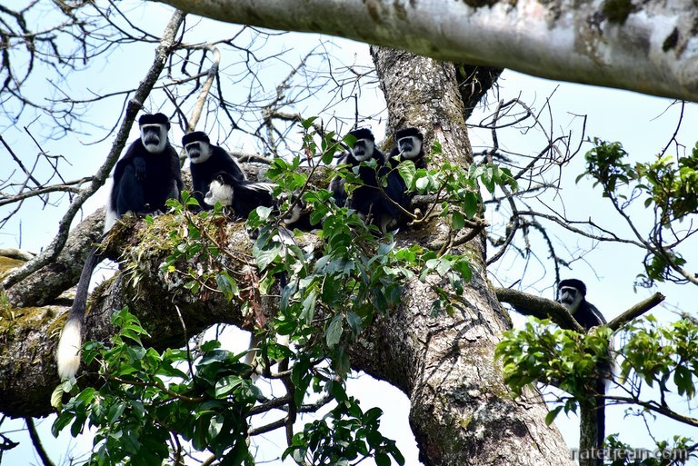 En chemin, tout près de Kisenyi, nous prenons le temps de photographier des colobes noirs et blancs. Leurs longs poils sur le dos et au bout de leur queue est une caractéristique qui ne nous laisse jamais indifférents.